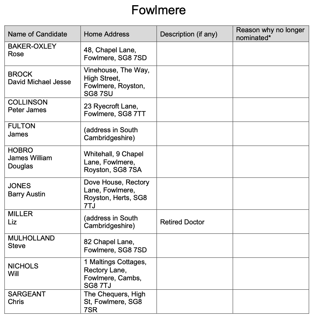 The Election for Parish Councillors in Fowlmere will be contested on May 7th 2026 alongside the District Council Elections.