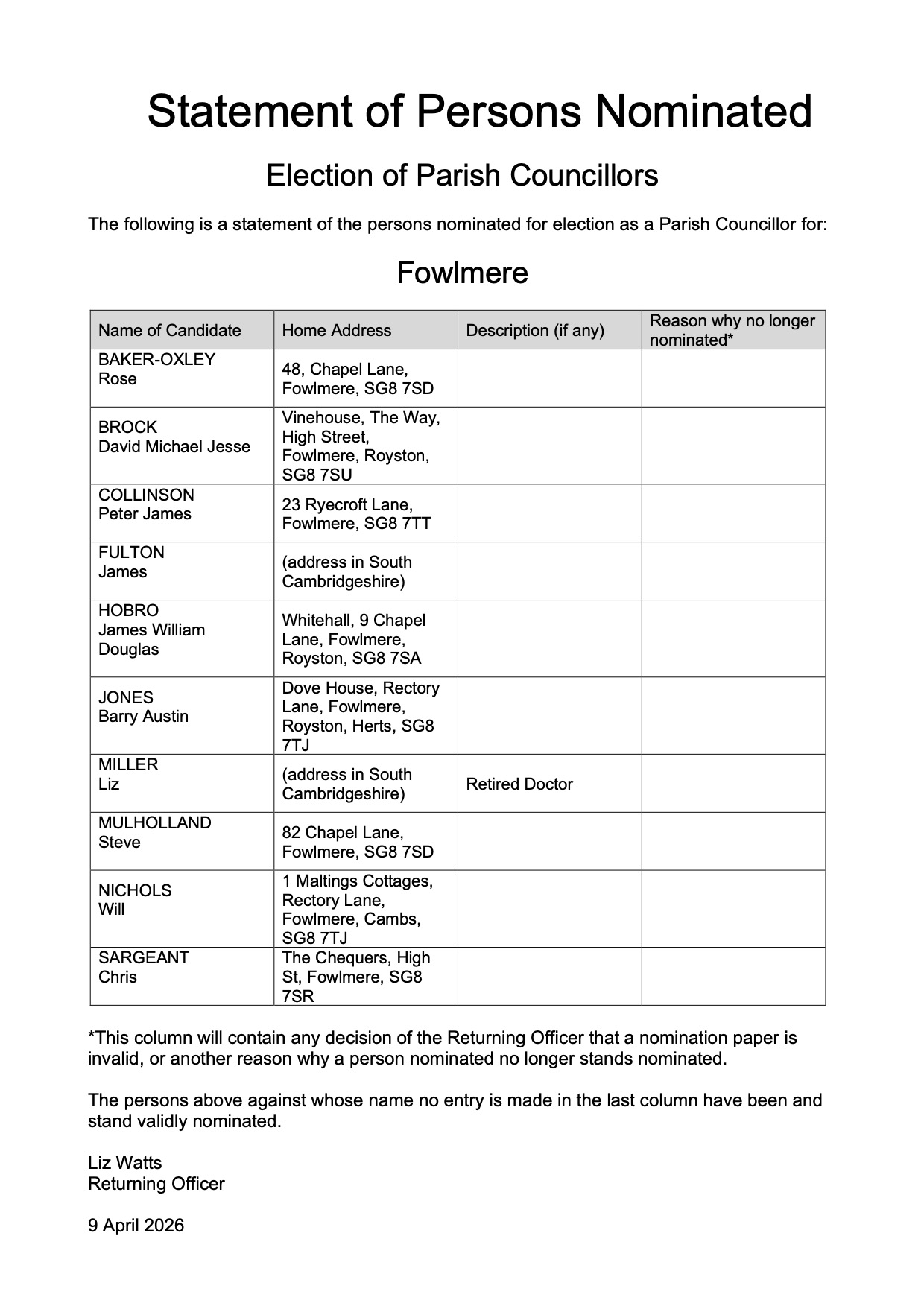 The Election for Parish Councillors in Fowlmere will be contested on May 7th 2026 alongside the District Council Elections. 10 Candidates are standing for the 9 Parish Council seats and residents will have the opportunity to choose who they would like to represent them on the Parish Council.