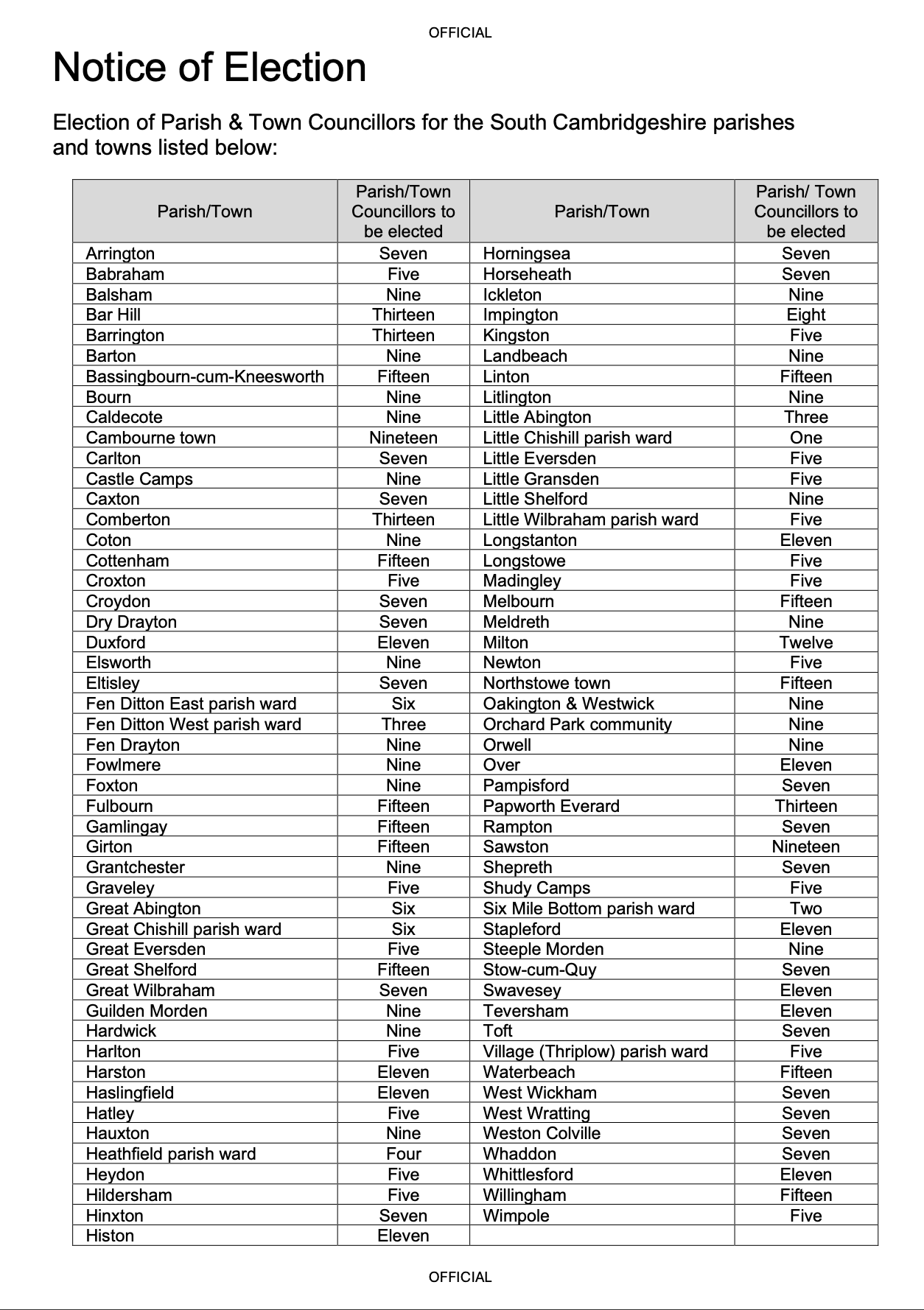 Election of Parish & Town Councillors for the South Cambridgeshire parishes and towns.