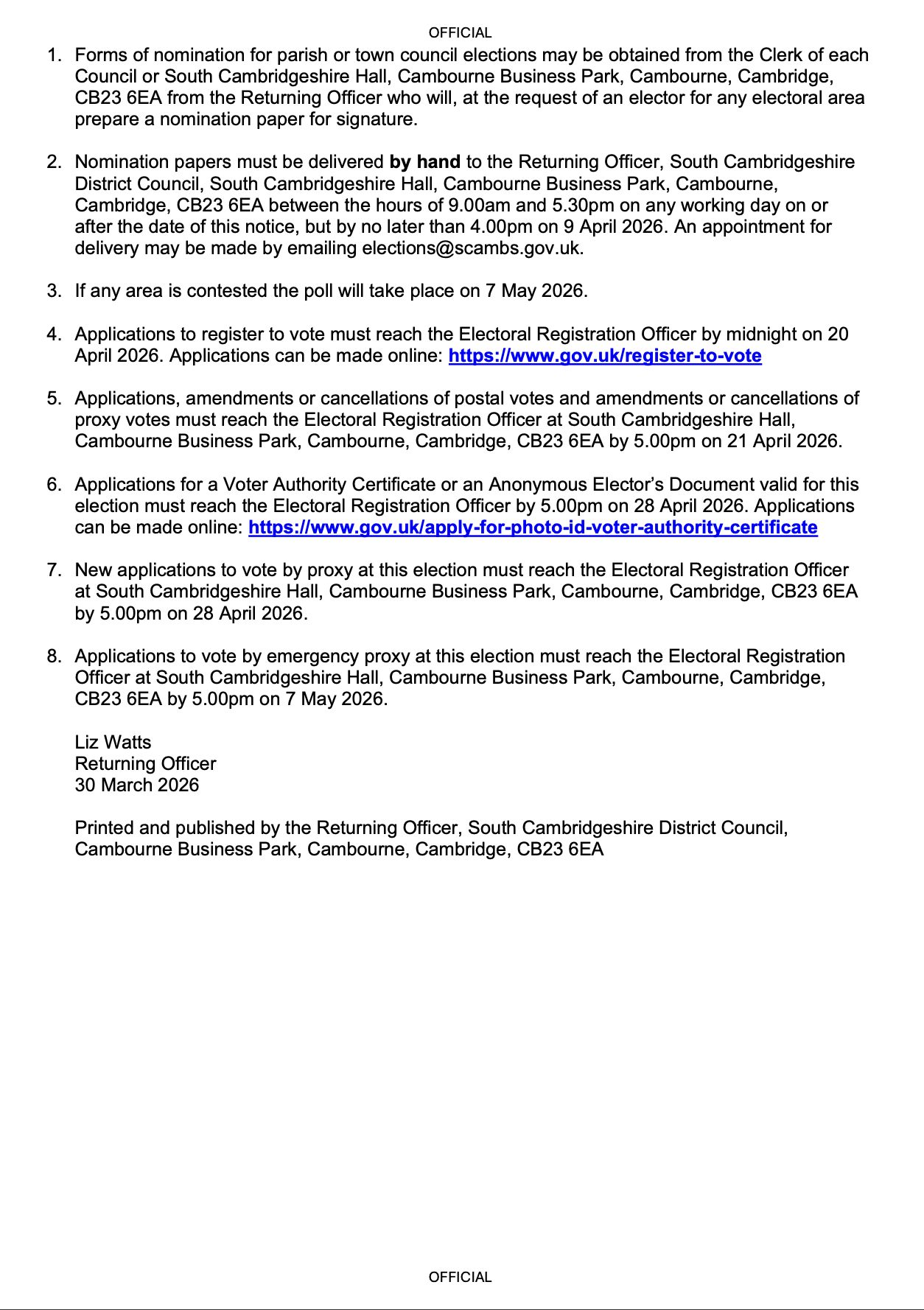 Applications to vote by emergency proxy at this election must reach the Electoral Registration Officer at South Cambridgeshire Hall, Cambourne Business Park, Cambourne, Cambridge, CB23 6EA by 5.00pm on 7 May 2026.